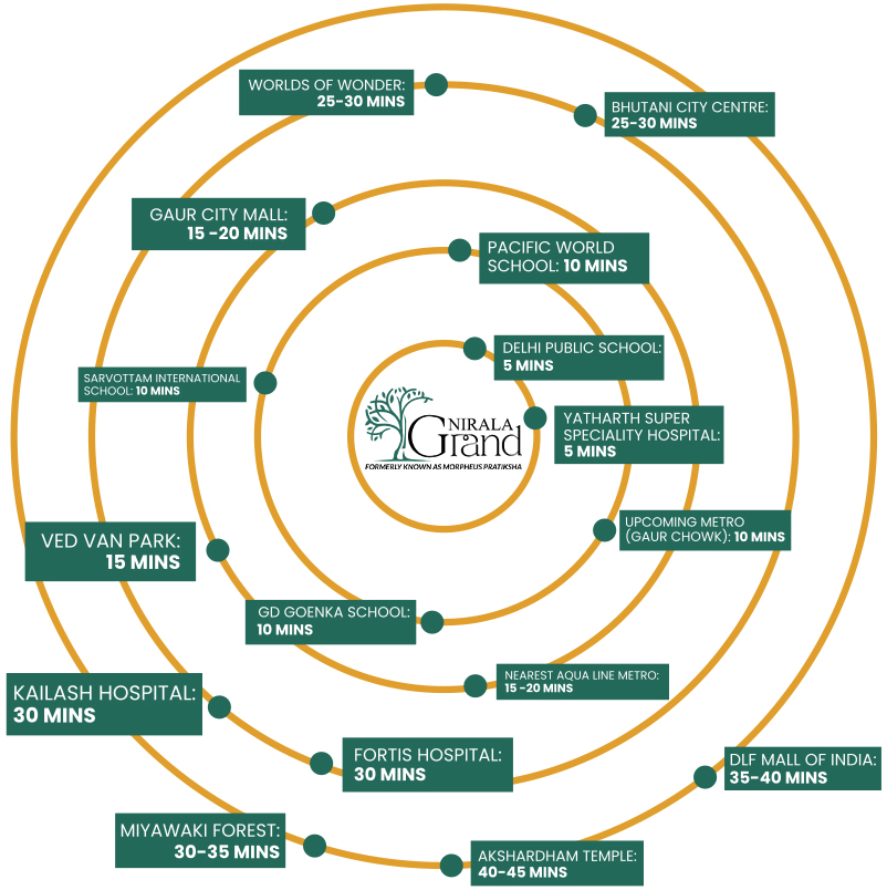NIRALA GRAND (formerly known as Morpheus Pratiksha), located in the vicinity of Noida, at Sector 1, Greater Noida West - A premium residential project that offers a harmonious blend of Indian heritage and modern luxury. From the spiritual tranquility of Brahmsthal and the timeless charm of the Central Banyan Tree to the elevated elegance of the Sky Walk and the serene luxury of the Moonwalk & Lounge, every space is thoughtfully designed to create a seamless balance between cultural richness and modern comfort. More than just amenities, these iconic spaces are enriching environments created to transform everyday moments into a living experience rooted in calm, connection, and luxury right in the essence of modern urban habitation.